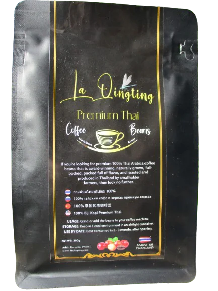 Besides being able to drink a cup of our Thai coffee at our partner restaurants, we also sell 200g bags of our ‘La QingTing’ premium ground coffee beans to guests and tourists to buy as a gift, to take home to their Phuket home, or to take home to their own Country.